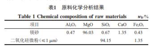 中頻爐爐襯作為感應(yīng)爐的重要組成部分,不但直接影響熔煉質(zhì)量,而且還影響生產(chǎn)成本。堿性爐襯具有抗堿性熔渣侵蝕的優(yōu)異性能,不污染鋼液,原料來(lái)源豐富,生產(chǎn)工藝簡(jiǎn)單,使用方便等優(yōu)點(diǎn)。目前,以硼酸為燒結(jié)劑的堿性爐襯應(yīng)用廣泛,但由于硼酸的強(qiáng)烈助熔作用,導(dǎo)致?tīng)t襯的使用壽命短、熔煉成本高。本試驗(yàn)以二氧化硅微粉為燒結(jié)劑,利用其顆粒小、活性大、填???? 粉。該二氧化硅微粉是冶煉金屬硅或硅鐵時(shí),產(chǎn)生的揮發(fā)性SiO或Si氣體遇空氣迅速氧化而成的非結(jié)晶相無(wú)定形圓球狀顆粒,表面較為光滑,粒度小于1 μm的占87%以上,平均粒徑在0.2~0.3 μm,比表面積為19.2 m2/g,活性高。化學(xué)成分分析見(jiàn)表1。表1 原料化學(xué)分析結(jié)果