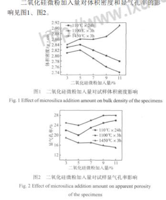 在110 ℃×24 h條件下烘干時(shí),當(dāng)二氧化硅微粉加 入量小于5%時(shí),由于二氧化硅微粉的顆粒小,分散性 好,可以填充顆粒與顆粒間的空隙[1],這使材料顆粒堆 積的致密度逐漸提高,氣孔率減少,體積密度逐漸增 加 (圖1);隨著二氧化硅微粉加入量的增加,材料中的氣孔率逐漸減少,材料致密度逐漸增加,體積密度 就逐漸增大;當(dāng)二氧化硅微粉加入量大于5%時(shí),隨著 二氧化硅微粉加入量的逐漸增多,二氧化硅微粉充填 空隙后出現(xiàn)過(guò)剩導(dǎo)致材料堆積致密度下降;同時(shí)大量 的二氧化硅微粉水化產(chǎn)物烘干后失去自由水和部分結(jié) 合水導(dǎo)致材料氣孔率逐漸增大 (圖2),從而使試樣的 體積密度逐漸減小。 在1 100 ℃×3 h條件下燒結(jié),試樣體積密度普遍小 于110 ℃×24 h樣品的體積密度 (圖1),而氣孔率普遍 高于1 10 ℃×24 h樣品的 (圖2)。因?yàn)樵? 100 ℃時(shí), 由于燒成溫度低,試樣達(dá)不到燒結(jié)溫度,材料內(nèi)部形 成的液相量少,不足以填充空隙以提高材料的致密度; 在此溫度下,試樣的主要變化是二氧化硅微粉水化產(chǎn) 物的完全脫水,二氧化硅微粉加入量越多,二氧化硅 微粉水化產(chǎn)物脫水引起氣孔率增加而導(dǎo)致體積密度減 小的影響就越強(qiáng),故隨著二氧化硅微粉加入量的增大, 試樣的體積密度呈減小的趨勢(shì);同時(shí)作為結(jié)合劑的二 氧化硅超微粉在升溫過(guò)程中發(fā)生晶型轉(zhuǎn)化,引起試樣 體積膨脹[2],體積密度變小。 在1 450 ℃×3 h條件下燒結(jié),試樣體積密度普遍增 大 (圖1)。隨二氧化硅微粉加入量的增加,試樣體積 密度逐漸增大,氣孔率逐漸降低 (圖2)。在1 450 ℃ 下,鎂質(zhì)澆注料中的MgO和SiO2生成鎂橄欖石[3],即: 2MgO+SiO2→2MgO·SiO2,這使材料燒結(jié),體積收縮, 結(jié)構(gòu)致密程度提高,體積密度增大。隨二氧化硅含量 的增加,2MgO·SiO2生成量逐漸增加,體積密度逐漸 增大,氣孔率逐漸降低。