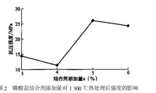 圖1、圖2是以磷酸鹽為結(jié)合劑、Al-80水泥為固化劑的四個(gè)配方試樣的性能檢測(cè)結(jié)果,隨著結(jié)合劑添加量的增大,110℃×24h烘干后澆注料試樣的抗壓強(qiáng)度呈上升趨勢(shì),但在≤4%和≥5%的添加量范圍內(nèi),隨結(jié)合劑添加量的增加試樣的抗壓強(qiáng)度增大幅度很小,而在4%~5%的范圍內(nèi),抗壓強(qiáng)度隨結(jié)合劑添加量的增加而急劇提高。對(duì)于經(jīng)1300℃熱處理后的試樣,結(jié)合劑添加量在≤4%和≥5%的范圍內(nèi),試樣的抗壓強(qiáng)度隨結(jié)合劑的增加而呈微弱的下降趨勢(shì),但抗壓強(qiáng)度隨結(jié)合劑添加量的增加而急劇提高。綜合可見(jiàn),對(duì)于本實(shí)驗(yàn)選擇的原材料與實(shí)驗(yàn)范圍內(nèi),磷酸鹽結(jié)合劑合理的添加量為4%~5%。