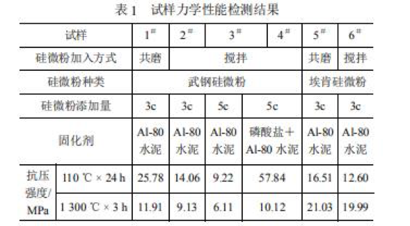 表1是以不同種類、不同添加量的硅微粉為結(jié)合劑和以磷酸鹽、Al-80水泥為固化劑的澆注料力學(xué)性能檢測(cè)結(jié)果。由表1可見(jiàn),硅微粉的種類、加入方式、添加量以及固化劑種類對(duì)試樣的力學(xué)性能影響較大。由1#、2#試樣和5#、6#試樣的檢測(cè)結(jié)果可見(jiàn),與硅微粉的直接攪拌加入方式相比,共磨加入方式能明顯改善澆注料的力學(xué)性能。由3#、4#試樣的檢測(cè)結(jié)果可見(jiàn),固化劑種類對(duì)澆注料性能影響較大,并可看出磷酸鹽與Al-80水泥組成的復(fù)合固化劑具有明顯改善修補(bǔ)料性能的效果,而Al-80水泥則效果不明顯。由2#、3#試樣的檢測(cè)結(jié)果可見(jiàn),硅微粉添加量的提高未能提高澆注料的力學(xué)性能。由采用相同的加入方式而硅微粉來(lái)源不同的1#、5#和2#、6#試樣的檢測(cè)結(jié)果可見(jiàn),??瞎栉⒎叟c武鋼硅微粉相比,能明顯改善澆注料熱處理后的力學(xué)性能,并且添加埃肯硅微粉的澆注料抗壓強(qiáng)度隨試樣的熱處理溫度的提高而不斷增大。綜合可見(jiàn),宜采用??瞎栉⒎圩鳛殒V質(zhì)澆注料的結(jié)合劑,合適的添加量應(yīng)為3c%左右。