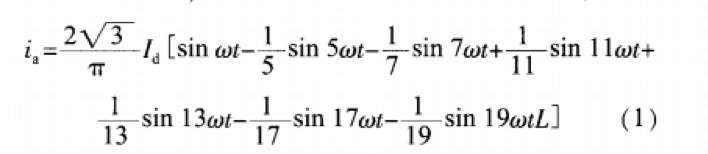 中頻電源注入電網(wǎng)的諧波主要是由整流裝置產(chǎn)生的.這里以三相6脈動(dòng)全控橋式整流電路為例來分析其諧波含量忽略三相橋式晶閘管整流電路換相過程和電流脈動(dòng).假定交流側(cè)電抗為0.直流電感為無窮大,利用傅里葉分析方法,將電流負(fù)、正兩半波的中點(diǎn)作為時(shí)間零點(diǎn),可推出交流側(cè)a相電流的表達(dá)式: