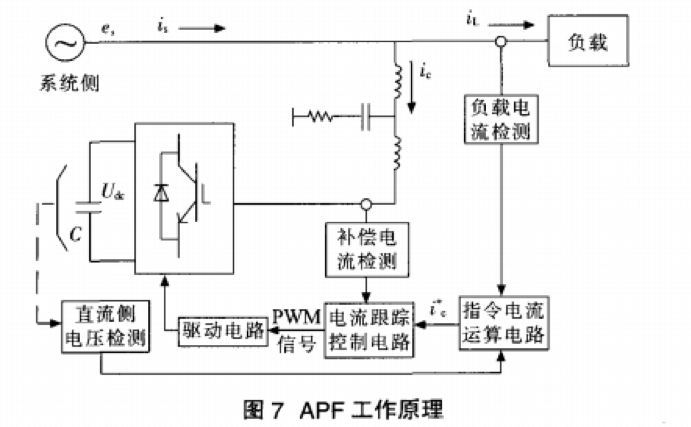 APF的工作原理如圖7所示。指令電流運(yùn)算電路,一方面為達(dá)到消除諧波和補(bǔ)償無功功率的目的,將負(fù)載電流,中的諧波電流和無功電流分離出來,產(chǎn)生調(diào)節(jié)信號(hào);另一方面為保持直流側(cè)電容電壓穩(wěn)定.采用PI調(diào)節(jié)控制法:將檢測(cè)到的電容電壓實(shí)際值與給定的參考電壓值相減之差通過PI調(diào)節(jié)器得到調(diào)節(jié)信號(hào),并將作為實(shí)際的補(bǔ)償電流指令值疊加到i。上,即: