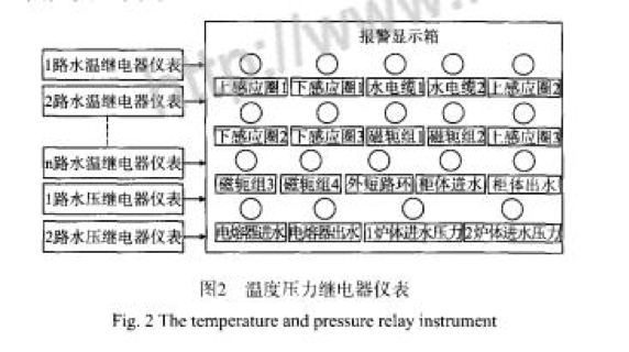 中頻電源的主控板上設(shè)有水溫、水壓超限報警指示燈,在冷卻水系統(tǒng)通好水后首先調(diào)整水壓繼電器,使主控板上水壓指示燈指示正常。另外在電源柜的進水管和m水管及電容器出水管安裝水溫繼電器儀表,爐體出水管各路都要安裝水溫繼電器儀表,爐體進水安裝水壓繼電器。所有水溫、水壓繼電器信號連接到報警顯示箱,當某一路超限或有故障時,報警箱中報警燈亮,并可發(fā)報警聲音提示,即可知道哪一條水路有問題,去現(xiàn)場相應(yīng)位置查找故障的原因。原琿框圖如圖2所示。