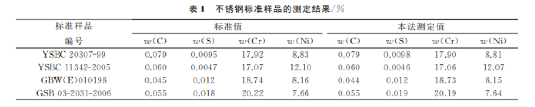 選取4個不銹鋼標(biāo)準(zhǔn)樣品,按本方法分析步驟進(jìn)行測定,結(jié)果如表1所示。