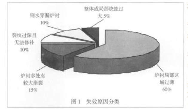 柳工機(jī)械股份有限公司鑄鋼廠每年熔煉鑄鋼鋼 液約 16000t,使用 6t 中頻爐和 3t 電弧爐熔煉碳鋼。長(zhǎng)期以來(lái)中頻爐使用一家知名的爐襯材 料供應(yīng)商提供的爐襯材料,但一直存在著中頻電爐爐襯壽命 偏短的問(wèn)題,平均爐襯壽命約 45 爐。爐襯壽命偏短 導(dǎo)致頻繁的修筑爐襯和烘爐,對(duì)生產(chǎn)組織和成本控 制都帶來(lái)了很不利的影響。為了解決這個(gè)問(wèn)題,從 2008 年 6 月開始,我們開始在延長(zhǎng)爐襯壽命方面進(jìn) 行探索。我們首先進(jìn)行了中頻爐煉鋼爐襯的失效原 因分析。 根據(jù)對(duì) 2008 年全年筑爐 25 次的失效統(tǒng)計(jì),目 前的中頻電爐爐襯材料最主要缺點(diǎn)是裂紋傾向大,爐襯容易 因裂紋而導(dǎo)致多處崩裂、造成局部區(qū)域過(guò)薄而失效; 其次是中頻電爐爐襯下部燒蝕過(guò)快導(dǎo)致爐襯失效。失效原因 分類見圖 1。