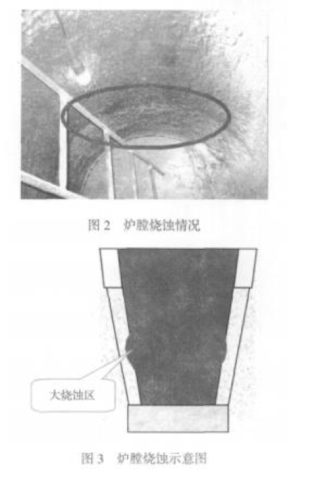 2009 年 2 月,我們與一家知名的爐襯材料供應(yīng) 商共同按照我們提出的性能要求選擇了一種爐襯材 料并進(jìn)行首次工藝試驗(yàn)。首次試驗(yàn)爐襯壽命為 40 爐次,未達(dá)到 預(yù)期要求。分析原因?yàn)闋t膛中下部局部燒蝕 過(guò)大造成失效,如圖 2、圖 3 所示。 從試驗(yàn)后拆爐過(guò)程看,爐襯整體未發(fā)現(xiàn) 有大的裂紋和崩裂。這說(shuō)明這種爐襯材料產(chǎn) 生裂紋的傾向性很小,安全性較好。爐襯的 上部和爐底損壞較??;但是在爐身中下部, 爐身 1/3 高度上有明顯的較大燒蝕區(qū).